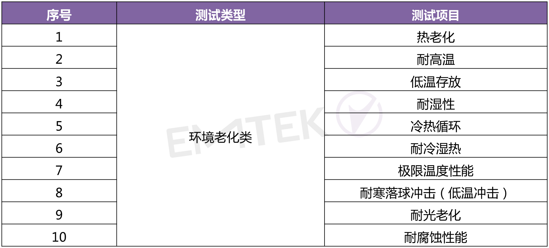 是將產(chǎn)品暴露在自然的或人工的環(huán)境條件下經(jīng)受其作用,以評價產(chǎn)品在實際使用、運輸和貯存的環(huán)境條件下的性能,并分析研究環(huán)境因素的影響程度,包含的環(huán)境試驗如熱老化、低溫存放、冷熱循環(huán)、低溫沖擊、耐光老化等;