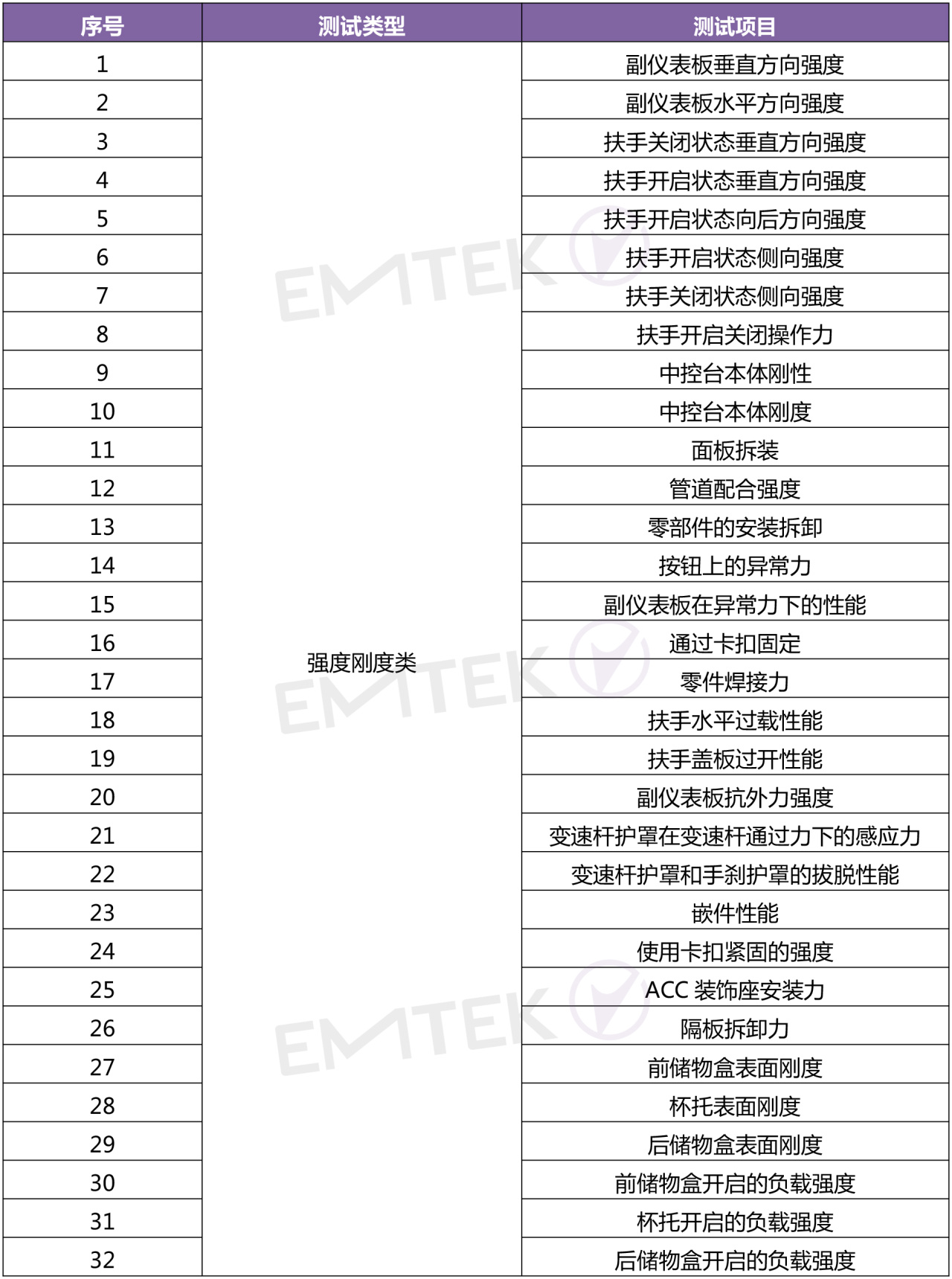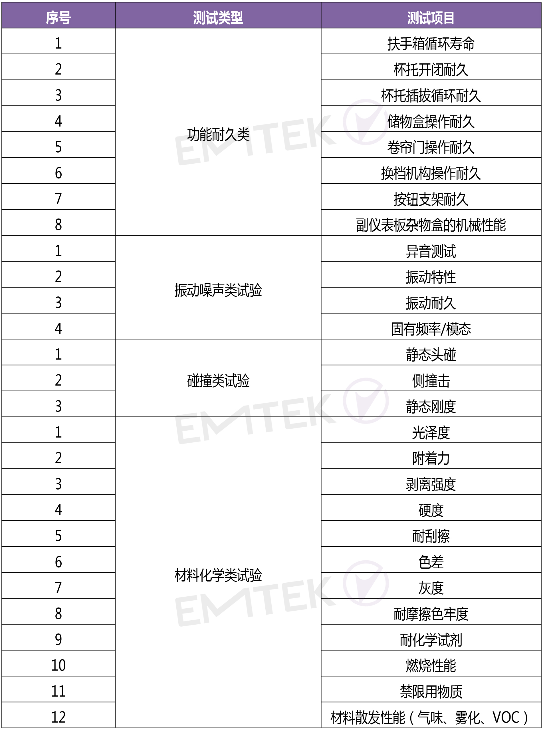 考核副儀表板使用過程中承受的強(qiáng)度和剛性、操作功能特性及耐久、振動試驗、碰撞試驗,比如副儀表板垂直/水平方向強(qiáng)度、扶手箱循環(huán)壽命、杯托開閉耐久、振動特性、振動耐久、頭碰、側(cè)撞擊等;