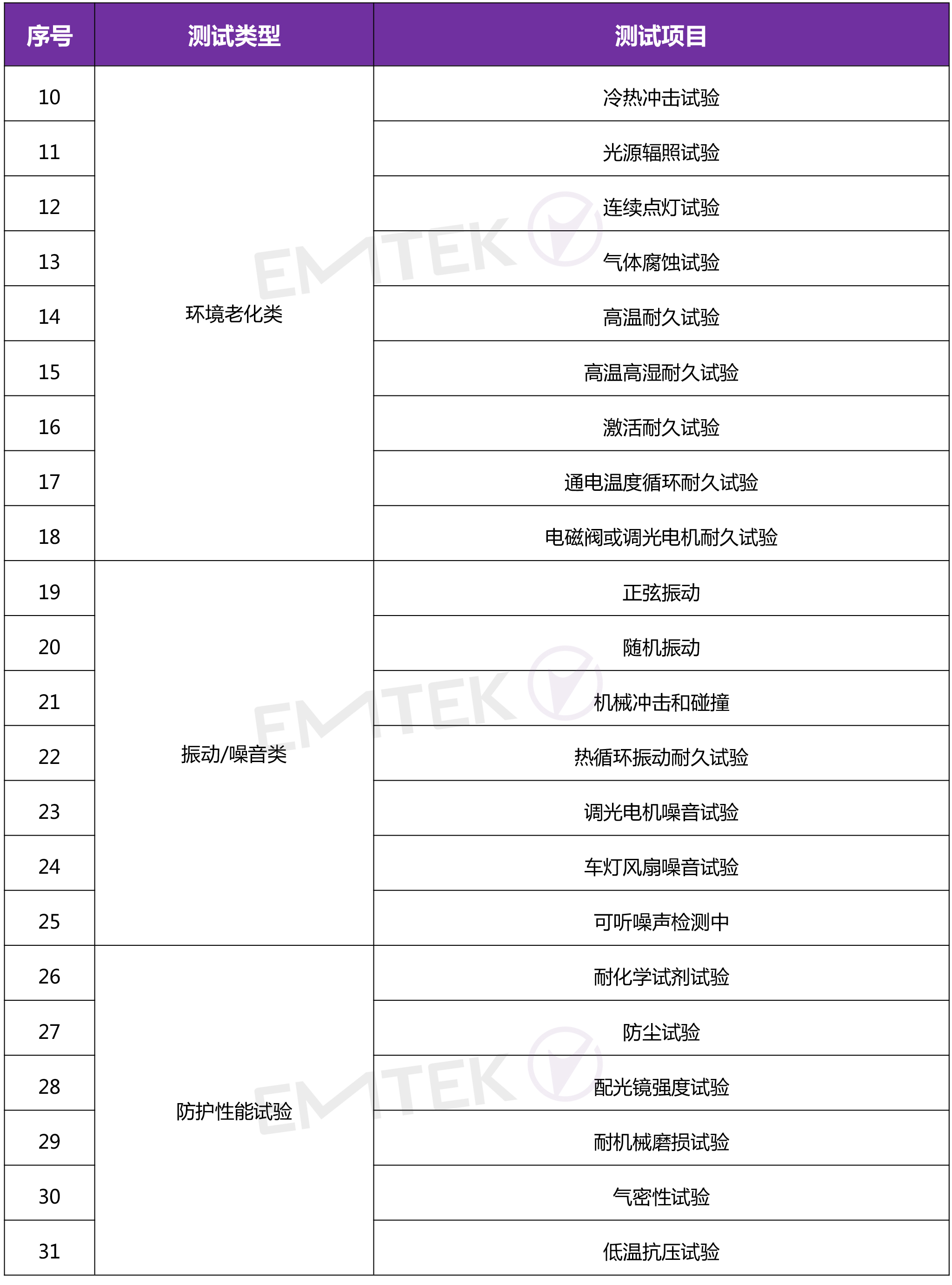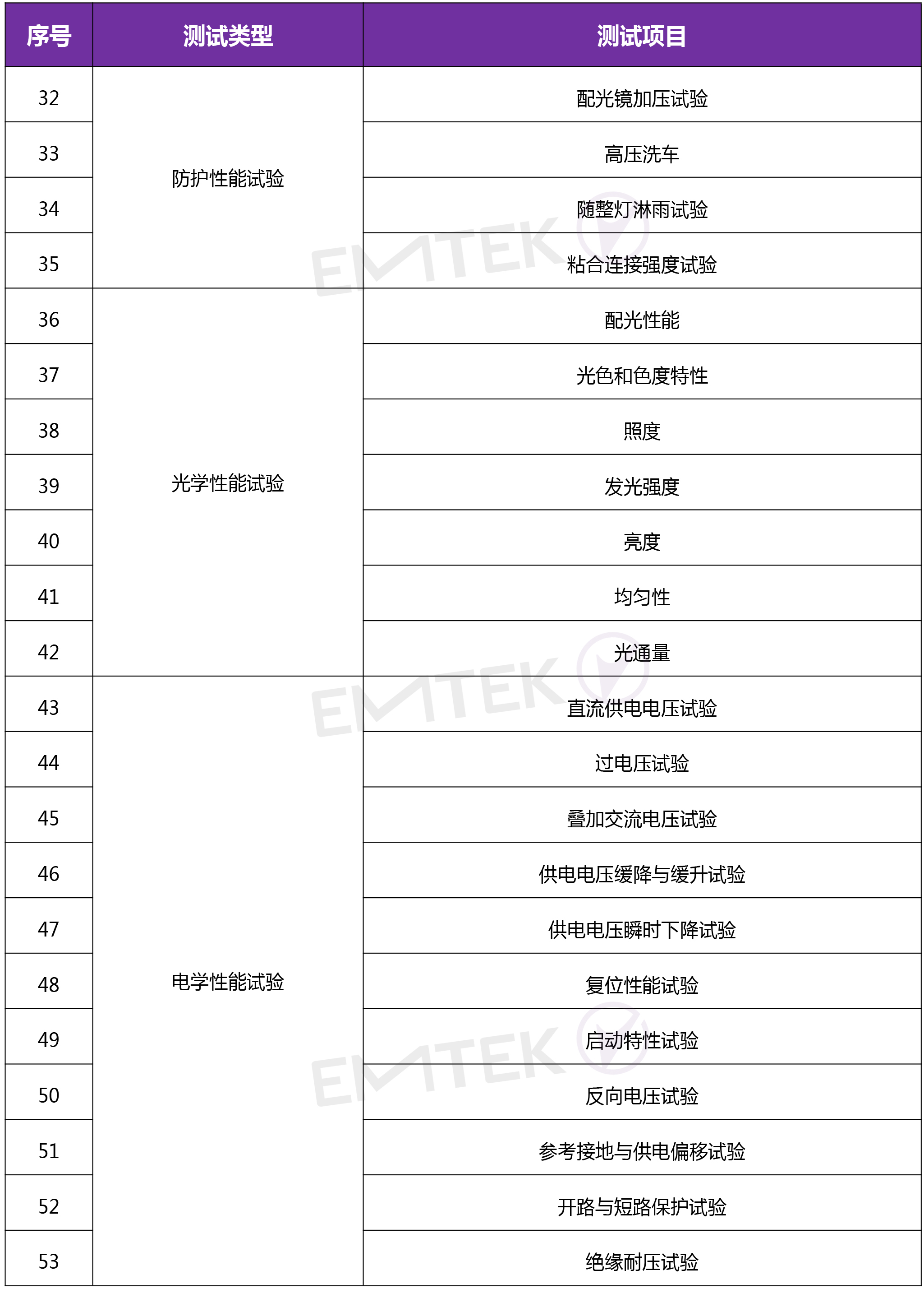 考核車(chē)燈的配光性能、光色和色度特性、照度、發(fā)光強(qiáng)度、亮度、均勻性等光學(xué)試驗(yàn),以及電學(xué)性能、EMC等;