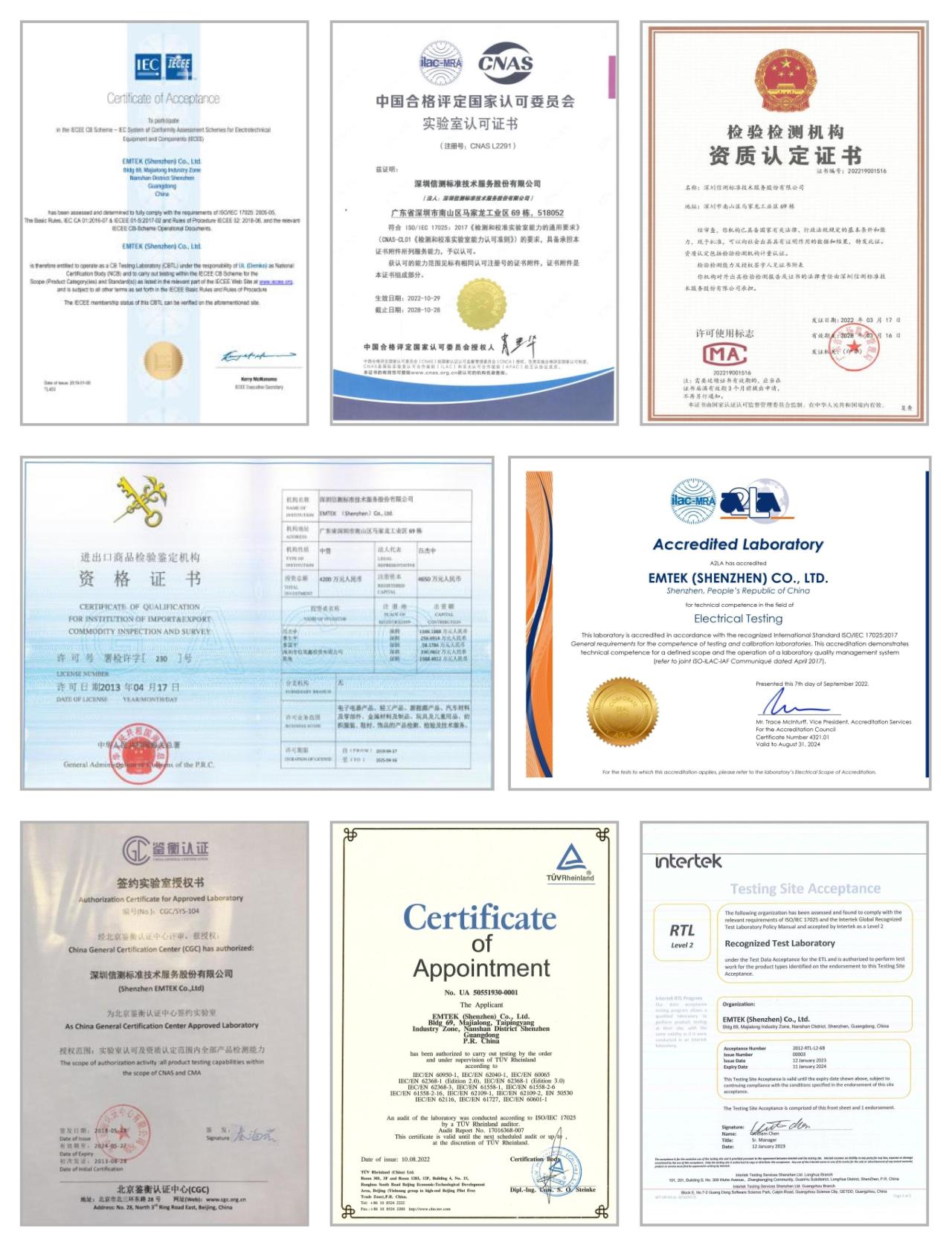 EMTEK信測標準是國內領先的光伏、風電、充電樁和儲能的檢驗檢測認證機構之一,新能源實驗室檢測范圍覆蓋了光伏設備、儲能設備和電動汽車充電樁等,服務內容有產品檢測、光伏電站驗收、電動車充電站驗收、風電場驗收等技術服務。作為第三方認證檢測服務商,信測標準是“檢驗檢測機構資質認定(CMA)”實驗室、“中國實驗室國家認可委員會實驗室認可(CNAS)”實驗室、國際電工委員會(IECEE)CB體系的CBTL實驗室,同時還是北京鑒衡認證中心(CGC)、美國UL、英國ITS、德國TUV萊茵、德國BV、加拿大CSA等機構的授權實驗室,可以為企業(yè)提供國內CGC、CQC認證以及國外CE、CB、UL、ETL、CSA、SAA和并網檢測等一站式國際認證服務。