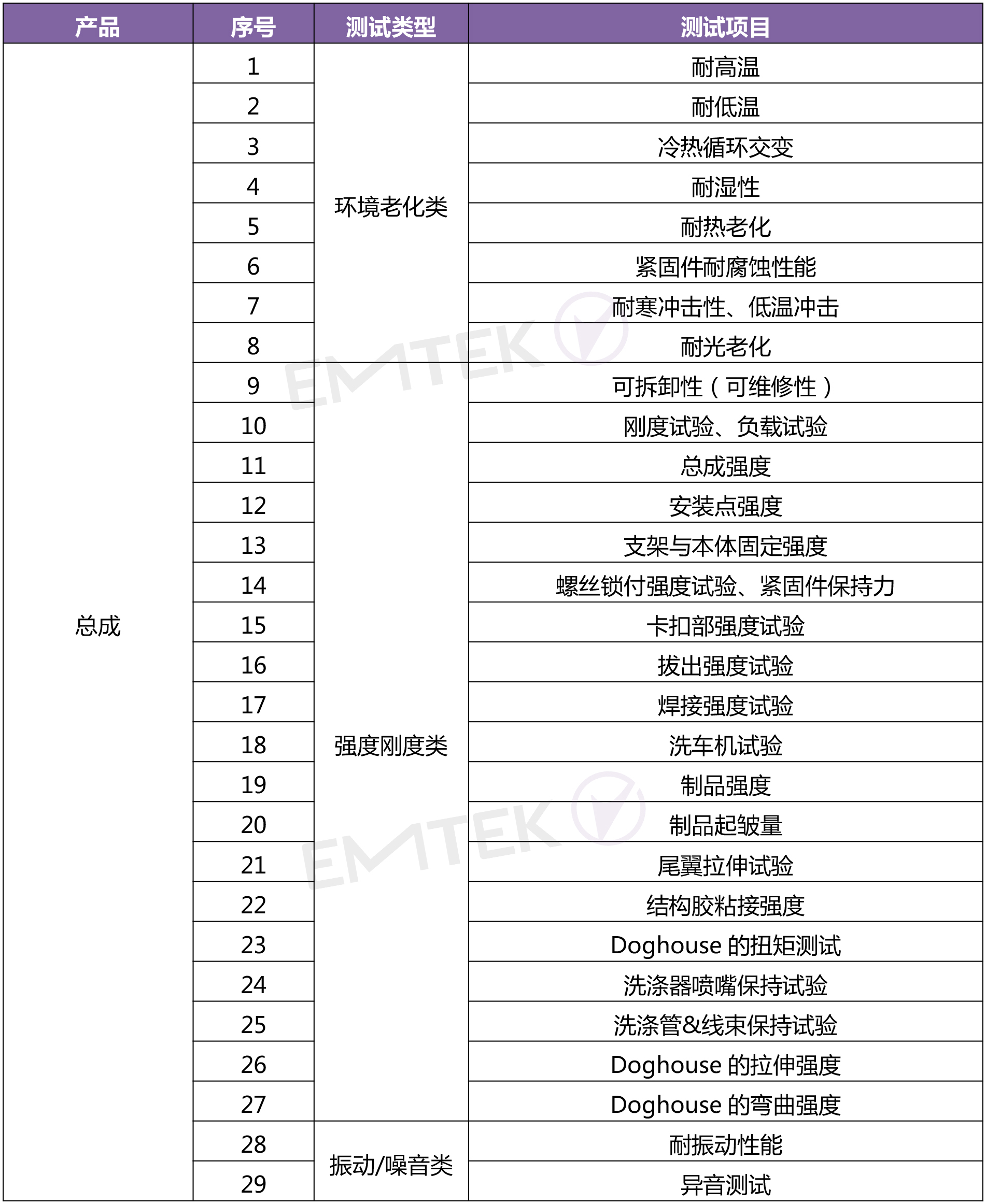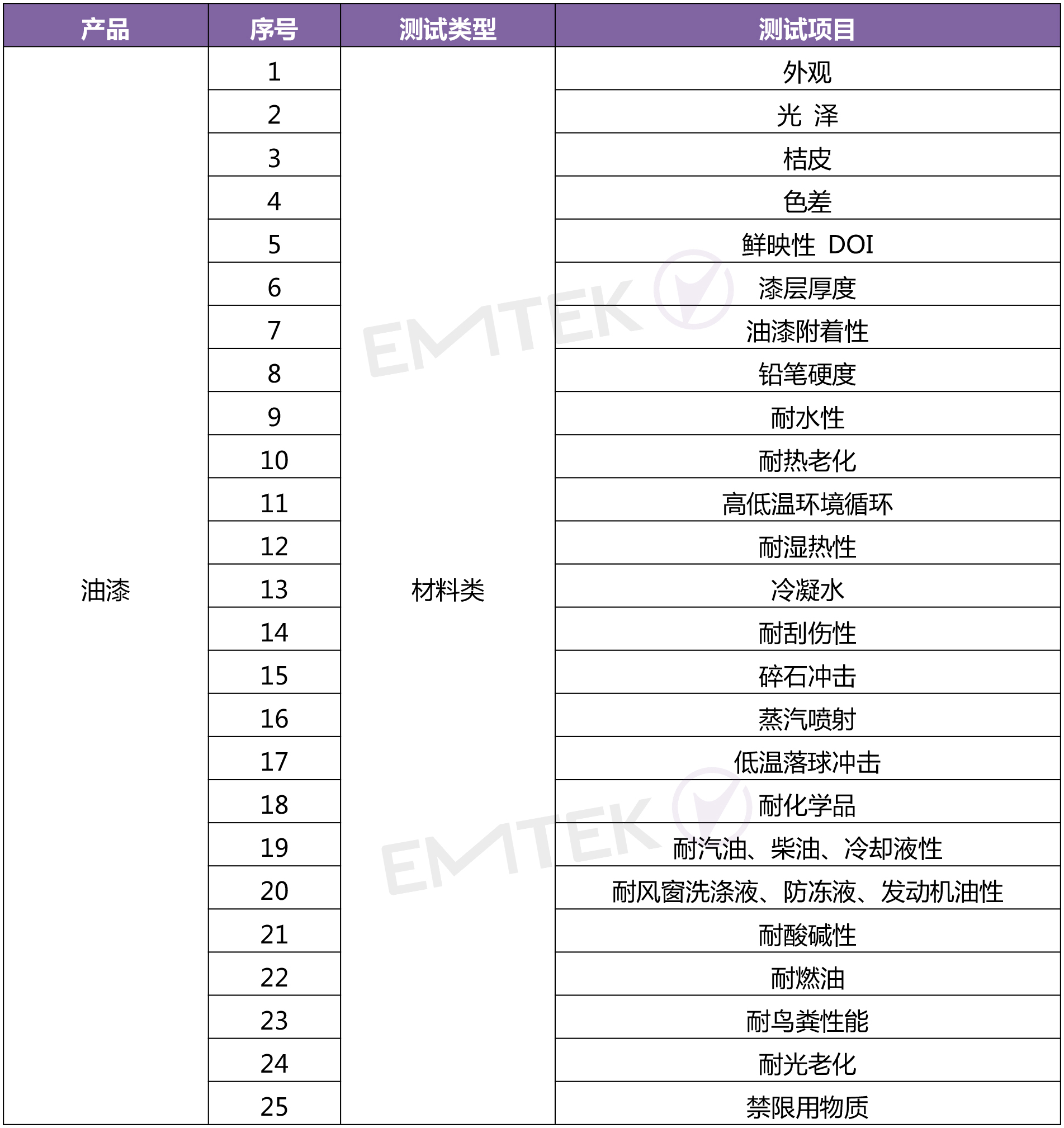 考核產(chǎn)品材料化學(xué)性能,比如外觀、光澤、漆膜厚度、鉛筆硬度、附著力、耐刮傷性、冷凝水、碎石沖擊、蒸汽噴射、耐化學(xué)品、禁限用物質(zhì)等等。