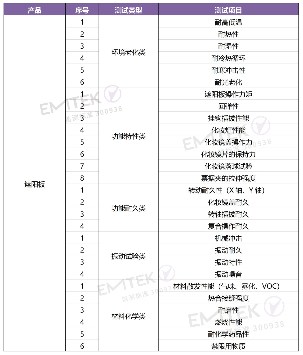 考核產(chǎn)品使用過(guò)程中承受的強(qiáng)度和剛性、操作功能特性及耐久、振動(dòng)試驗(yàn),比如遮陽(yáng)板操作性能、遮陽(yáng)板翻轉(zhuǎn)耐久、振動(dòng)耐久、振動(dòng)噪音等;