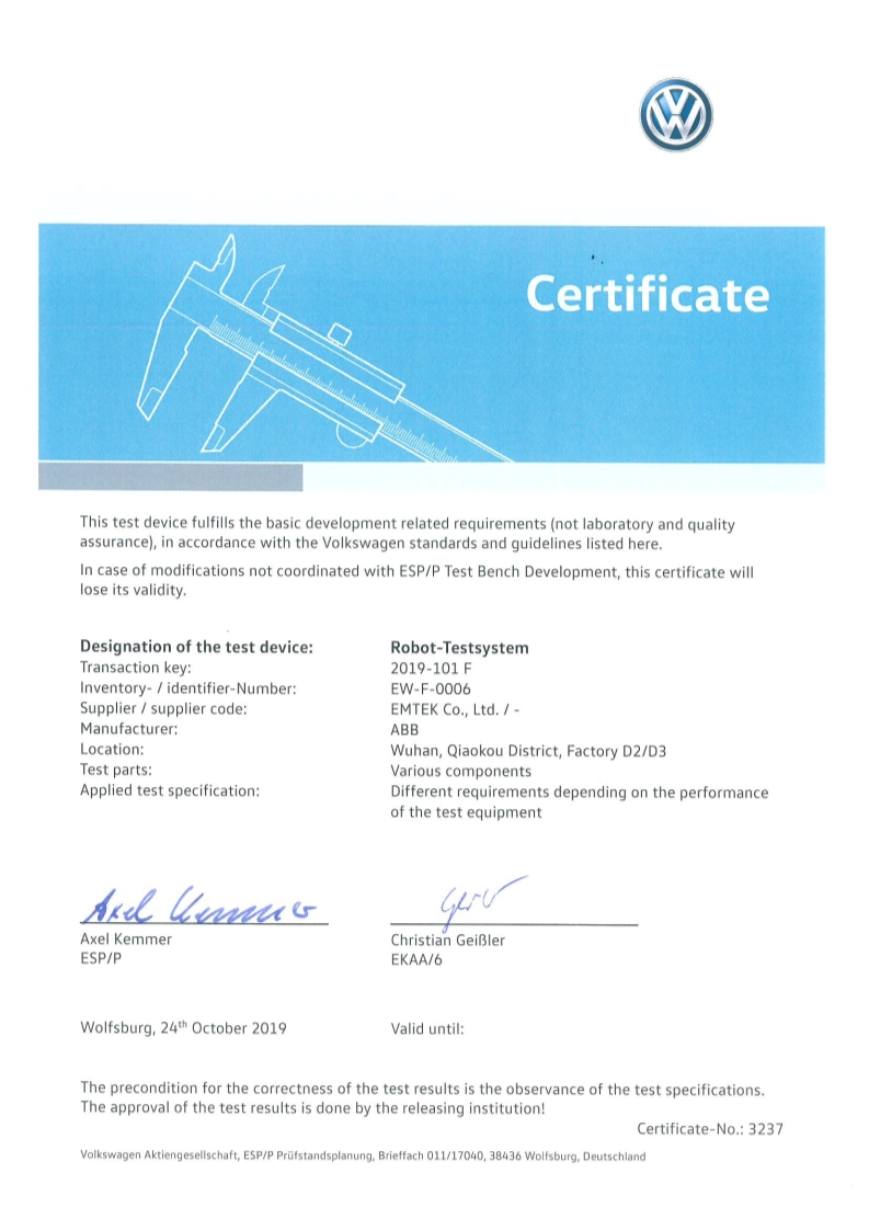 大眾認(rèn)可證書-機(jī)器人測試系統(tǒng)