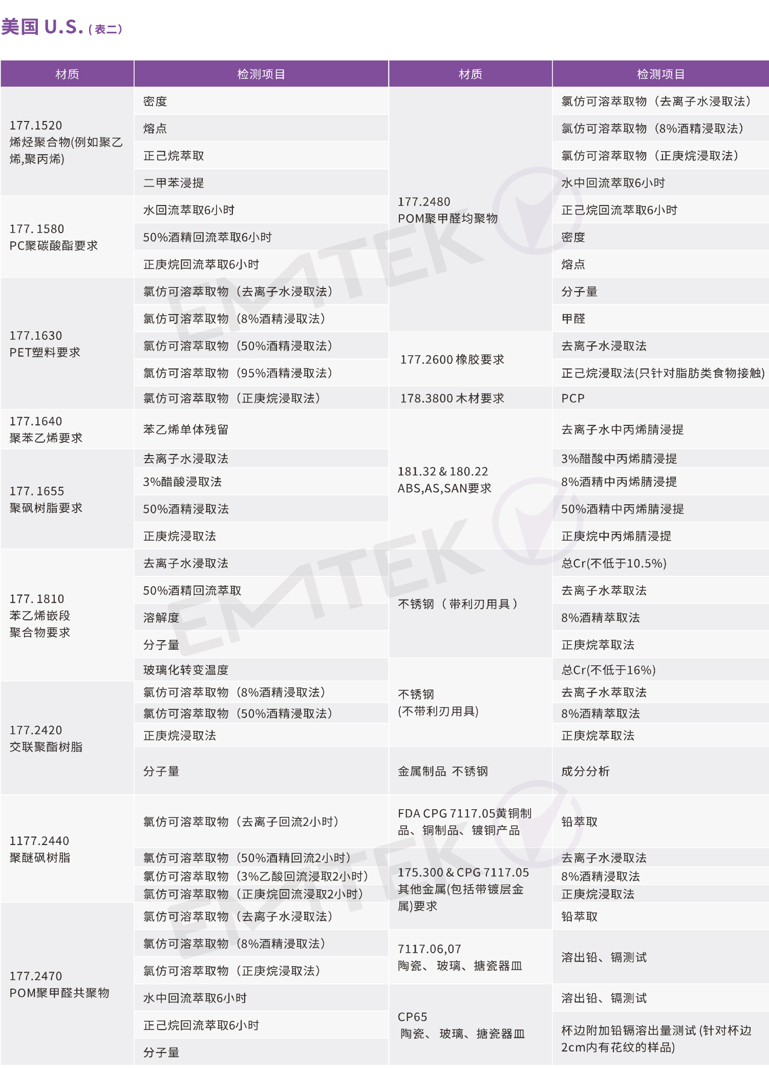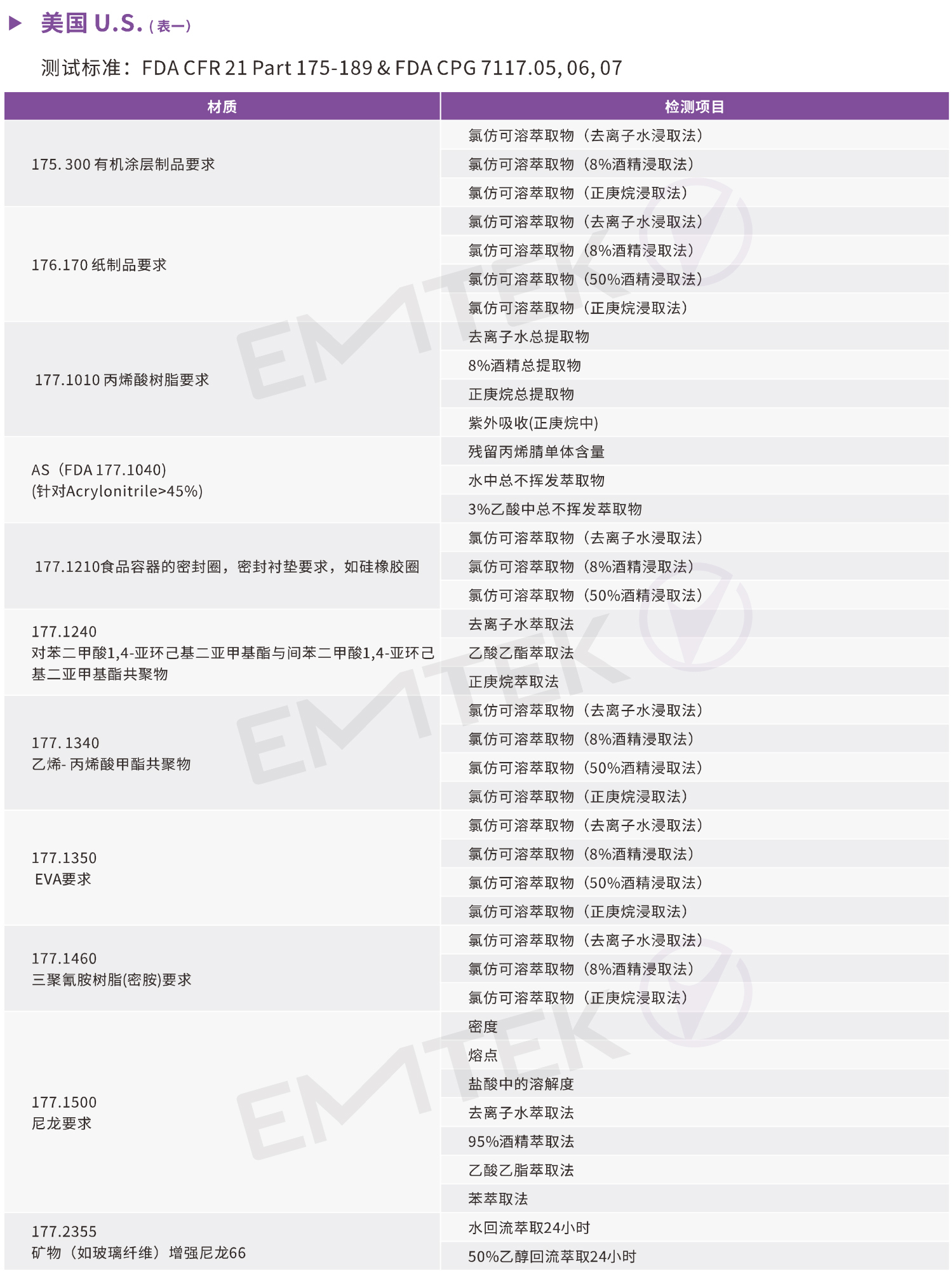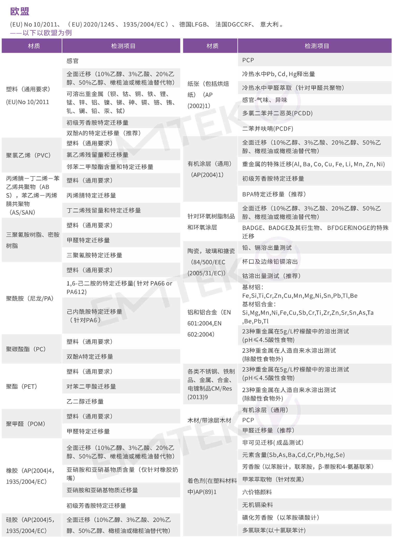EMTEK信測(cè)標(biāo)準(zhǔn)實(shí)驗(yàn)室依據(jù)GB 4806系列、歐盟(EC) No 1935/2004、德國(guó)LFGB、法國(guó)DGCCRF、美國(guó)FDA 21 CFR等等標(biāo)準(zhǔn)法規(guī)要求,提供食品接觸材料及其制品的相關(guān)檢測(cè)服務(wù),綜合評(píng)價(jià)您的產(chǎn)品是否符合法規(guī)和市場(chǎng)要求,保障消費(fèi)者的安全與健康。