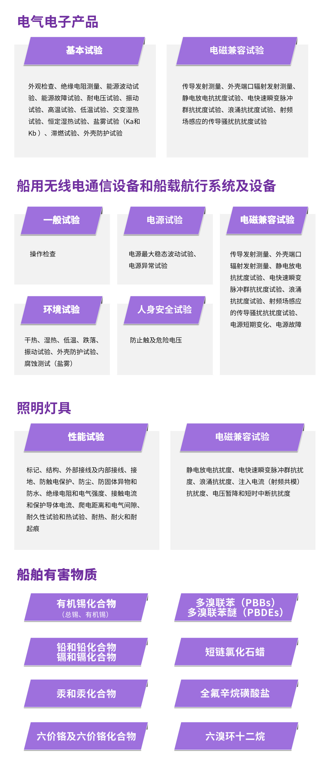 本次信測標準獲頒中國船級社資質認可的范圍覆蓋電氣電子產品、船用無線電通信設備和船載航行系統及設備、照明燈具、船舶有害物質等領域共計61項檢測項目。