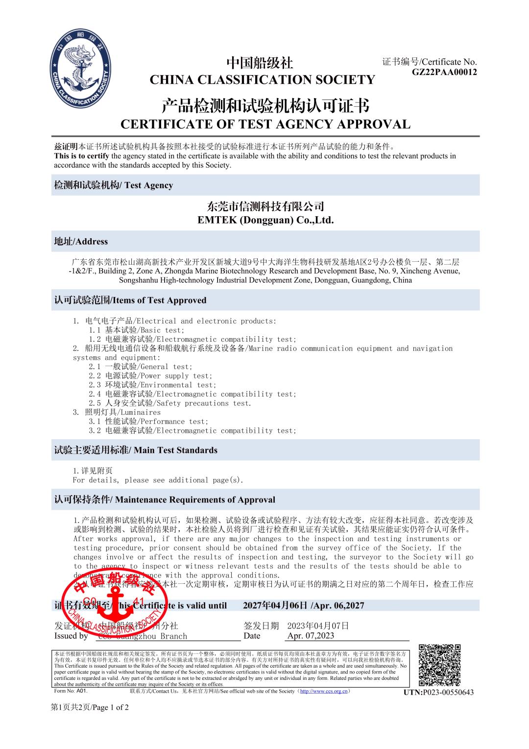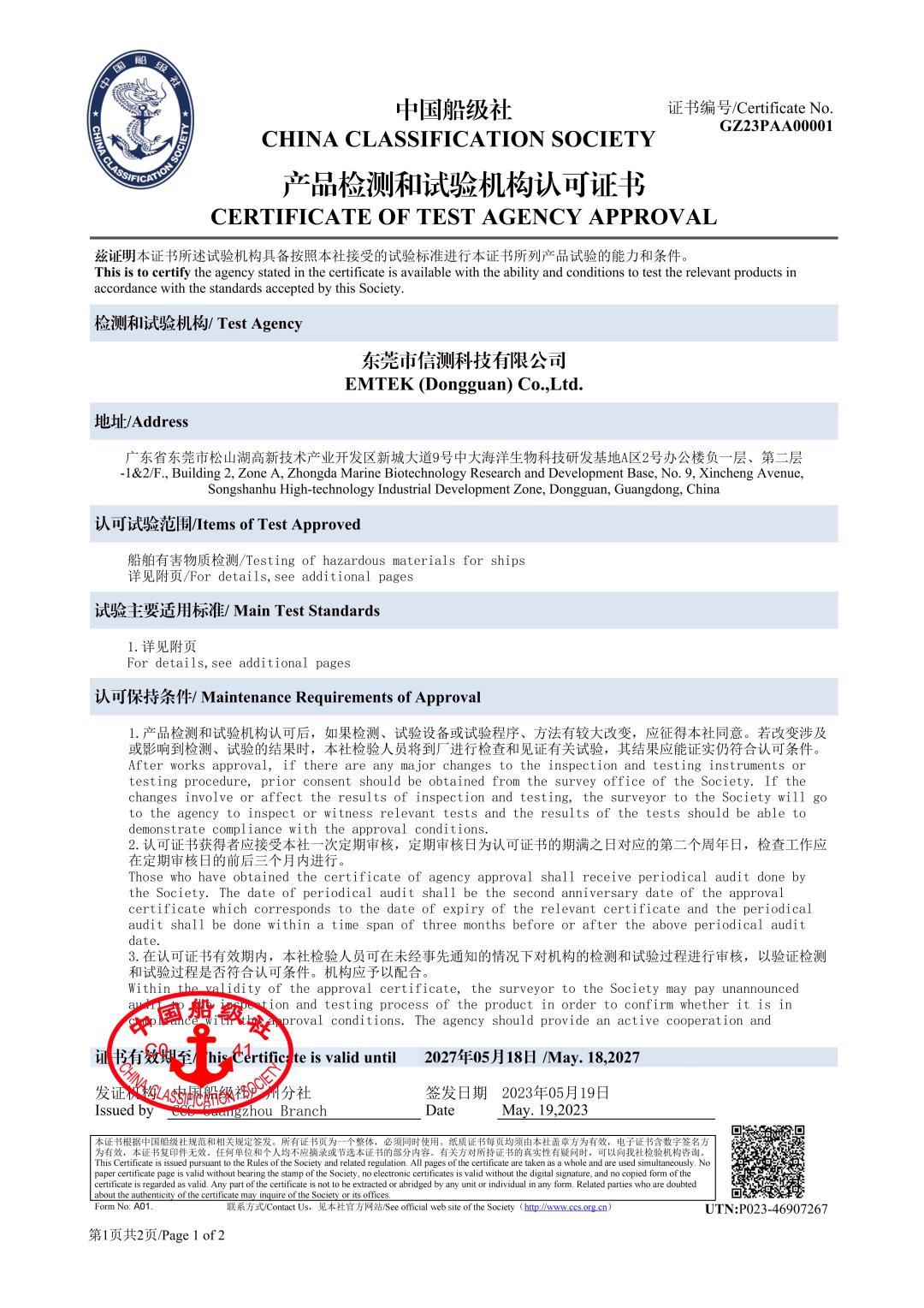 近日,東莞市信測科技有限公司(簡稱:東莞信測)憑借過硬的檢測技術和運行管理能力,順利通過中國船級社(China Classification Society,簡稱:CCS)嚴格的產品檢測和試驗機構評審,繼深圳信測后再獲“中國船級社產品檢測和試驗機構”的認可資質。