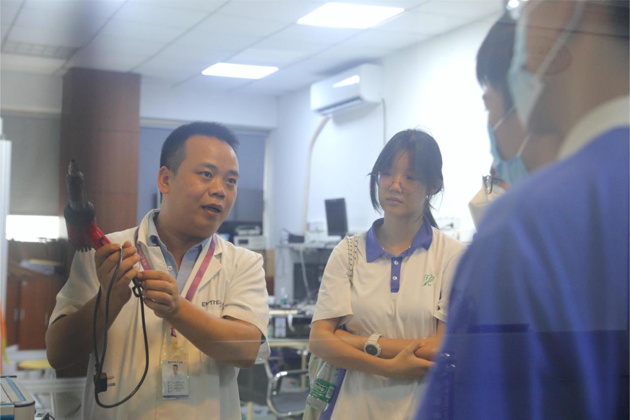 講座結(jié)束后,在工程師的帶領(lǐng)下,科創(chuàng)指導(dǎo)老師和學(xué)生們走進(jìn)信測(cè)實(shí)驗(yàn)室和研發(fā)創(chuàng)新一線,實(shí)地觀摩并親身體驗(yàn)真實(shí)科學(xué)環(huán)境。在EMC(電磁兼容性)實(shí)驗(yàn)室與安規(guī)實(shí)驗(yàn)室,學(xué)生親自動(dòng)手進(jìn)行電源線扭典和沖擊的科學(xué)實(shí)驗(yàn)操作,通過(guò)實(shí)踐操作,學(xué)生更加深刻體會(huì)到科學(xué)原理的奧妙與科學(xué)方法的精髓。每一次的實(shí)驗(yàn)嘗試,不僅是對(duì)思維的拓展,對(duì)技能水平的錘煉,更為學(xué)生們未來(lái)的科技創(chuàng)新之路鋪設(shè)了堅(jiān)實(shí)的基石。