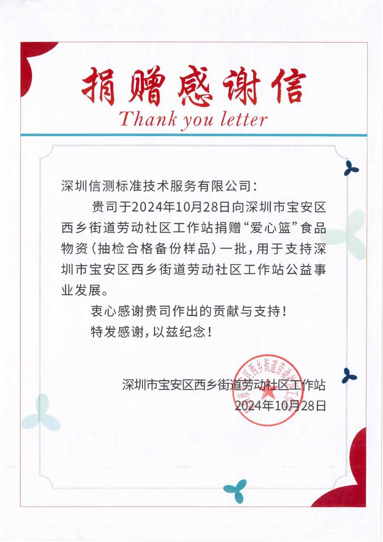 深圳市寶安區(qū)西鄉(xiāng)街道勞動社區(qū)工作站為深表謝意,特向信測標(biāo)準(zhǔn)頒發(fā)了感謝信,以此作為對信測標(biāo)準(zhǔn)慷慨捐贈的崇高敬意。