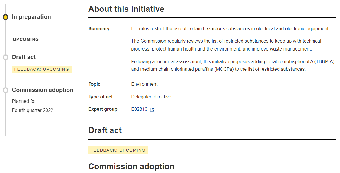 近日,歐盟委員會(huì)(European Commission)在其立法公眾咨詢平臺(tái)“有你說(shuō)”發(fā)布了一項(xiàng)關(guān)于限制在電氣電子設(shè)備中使用某些有害物質(zhì)的立法動(dòng)議(Initiative)。歐盟委員會(huì)經(jīng)過(guò)技術(shù)評(píng)估,動(dòng)議將四溴雙酚A(TBBP-A) 和中鏈氯化石蠟 (MCCP) 添加到RoHS指令的限制物質(zhì)清單中。如果該動(dòng)議順利被采納, 包括之前已經(jīng)存在的10種受限物質(zhì),RoHS指令的附件II里的受限物質(zhì)將增加至12種。