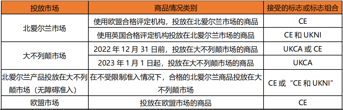 受 UKCA 認(rèn)證法規(guī)影響的產(chǎn)品包括但不限于個人防護裝備(PPE),如頭盔、太陽眼鏡,玩具,電子電氣設(shè)備(EEE)等。歐盟、大不列顛、北愛爾蘭市場各市場在不同階段可以接受的標(biāo)志如下: