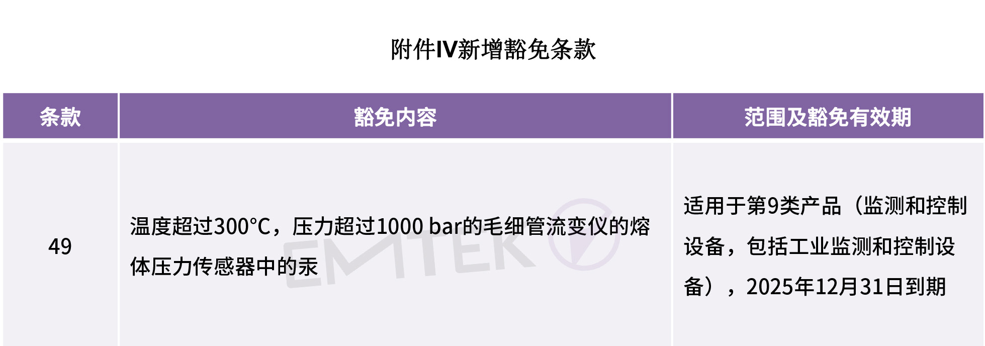 2023年7月11日,歐盟官方公報(bào)發(fā)布了指令(EU)2023/1437,在RoHS指令附件IV中新增第49條關(guān)于汞的豁免條款,針對(duì)第9類(lèi)產(chǎn)品 - 監(jiān)測(cè)和控制設(shè)備,包括工業(yè)監(jiān)測(cè)和控制設(shè)備,將于發(fā)布后的20天后生效。