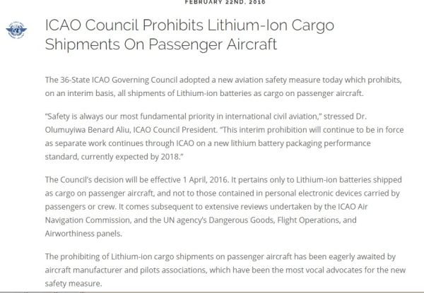 2016年2月22日,美國聯(lián)合國國際民航組織(ICAO)頒布臨時禁令,禁止所有可充電鋰電池通過客機(jī)的托運(yùn)。這一禁令將至少延續(xù)至2018年。這是繼兩年前停止客機(jī)裝載鋰金屬電池后的又一嚴(yán)格的禁令。也就是說:客機(jī)將停止運(yùn)輸包括鋰離子電池、鋰金屬電池的所有鋰電池品種。