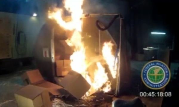 FAA曾經(jīng)模擬一個航機(jī)貨艙裝滿鋰離子電池,當(dāng)電池短路,釋放出氫氣等氣體,氣體燃燒時發(fā)生強(qiáng)烈爆炸,艙內(nèi)濃煙密布,機(jī)艙內(nèi)的滅火系統(tǒng)雖然可以撲滅火種,但未能阻止電池繼續(xù)發(fā)熱,令火勢死灰復(fù)燃,爆炸威力可爆開飛機(jī)機(jī)身。