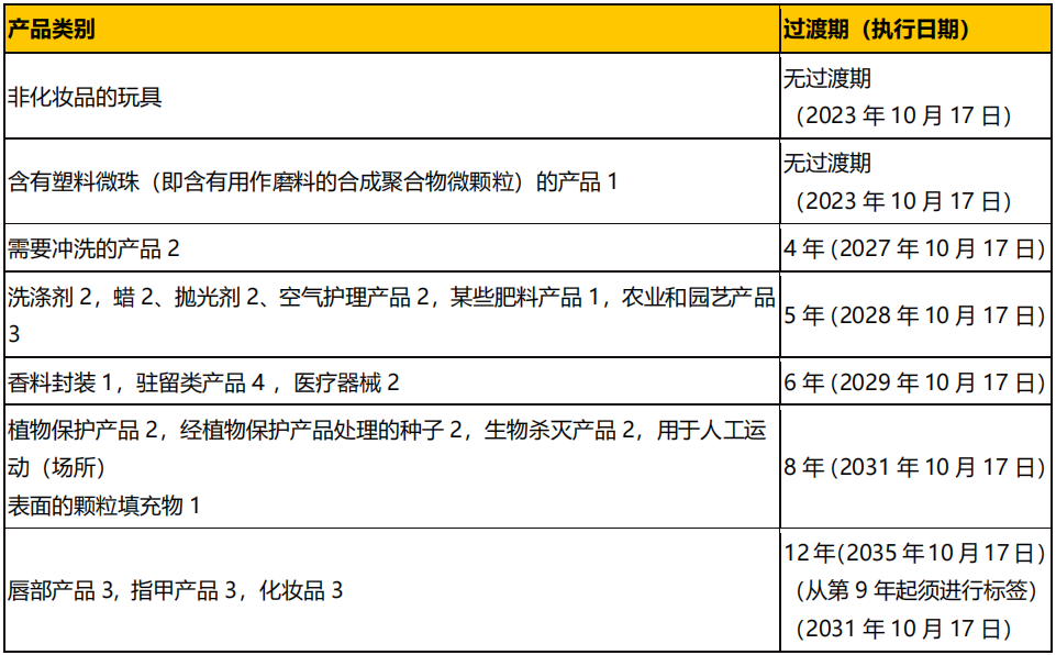 (3)自 2035 年 10 月 17 日起,唇部產(chǎn)品、指甲產(chǎn)品以及化妝品除非此類產(chǎn)品屬于第(1)或(2)點(diǎn)。如唇部產(chǎn)品、指甲產(chǎn)品以及化妝品含有微珠,則自 2023 年 10 月 17 日起適用;