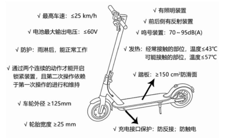 該標(biāo)準(zhǔn)要求電動(dòng)滑板車的最高車速不得大于 25km/h,電池最大輸出電壓不得大于 60V。主要從電動(dòng)滑板車的機(jī)械強(qiáng)度和電氣安全方面做出了具體的要求。除此之外,電動(dòng)滑板車還應(yīng)裝有照明裝置、反射裝置和鳴號裝置等,多方面的規(guī)范以保障電動(dòng)滑板車的安全使用。