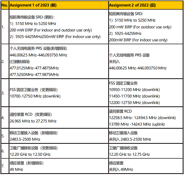 馬來西亞通訊與多媒體委員會(huì)(MCMC)于8 月28 日發(fā)布了2023 年第 1 號分配表(Class Assignment 1 of 2023), 取代2022 年7 月25 日生效的分配表(Class Assignment No.2 of 2022)。新版分配表詳細(xì)列出了不同產(chǎn)品無線規(guī)格、適用頻段、功率限值以及管控Schedule 具體要求(共計(jì)30 類 Schedule)。