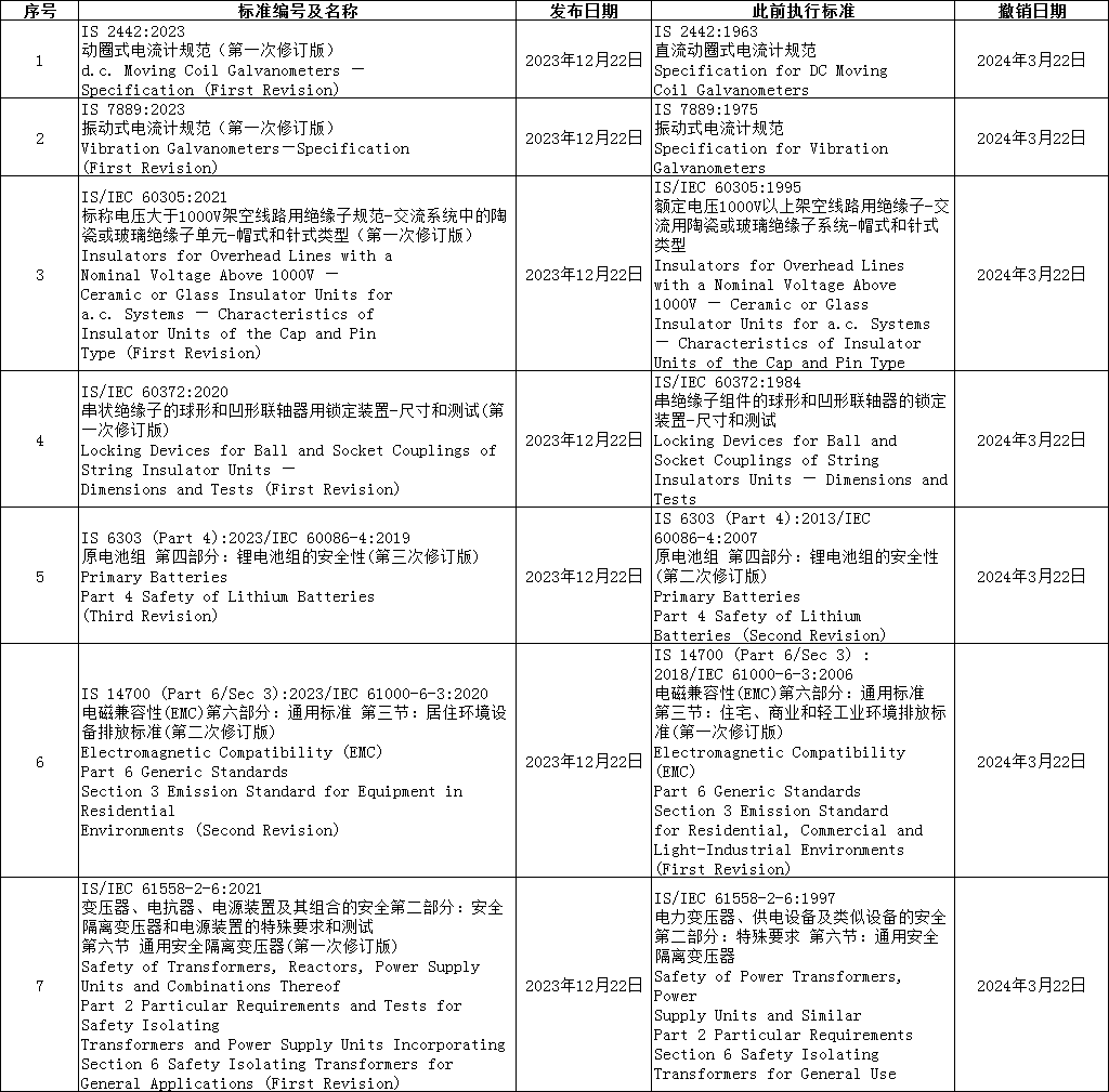 2023 年 12 月 27 日,印度標(biāo)準(zhǔn)局修訂并發(fā)布電流計、鋰電池、變壓器等 7 項標(biāo)準(zhǔn),修訂后標(biāo)準(zhǔn)自發(fā)布之日起正式生效,此前執(zhí)行標(biāo)準(zhǔn)將于 2024 年 3 月 22 日撤銷,具體修訂情況如下。