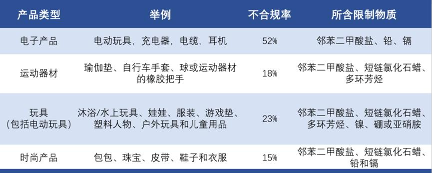 2023 年 12 月,歐洲化學(xué)品管理局(ECHA)論壇公布了第 10 次聯(lián)合執(zhí)法項目(REF-10)的調(diào)查結(jié)果。結(jié)果顯示,市場上某些消費品中含有過量的危險化學(xué)品,如鉛和鄰苯二甲酸鹽,總不合規(guī)率達(dá)到了 18%。