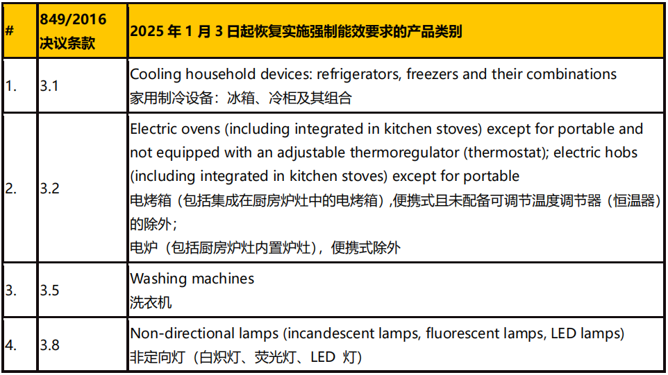 根據白俄羅斯部長理事會 2024 年 9 月 26 日第 708 號決議,白俄羅斯針對 2016 年 10 月 21 日發(fā)布的第849 號決議中列出的部分(四類)使用能源的電器產品將恢復實施強制性能源效率/能效標簽要求,強制實施日期為 2025 年 1 月 3 日。