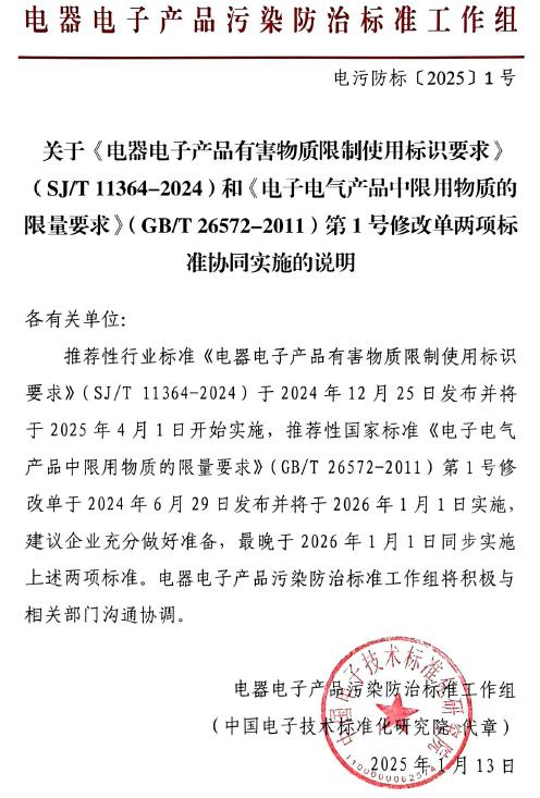 2024 年 1 月 13 日,中國電器電子產品污染防治標準工作組發(fā)布了關于《電器電子產品有害物質限制使用標識要求》(SJ/T11364-2024)和《電子電氣產品中限用物質的限量要求》(GB/T26572-2011)第 1 號修改單兩項標準協(xié)同實施的說明通知。
