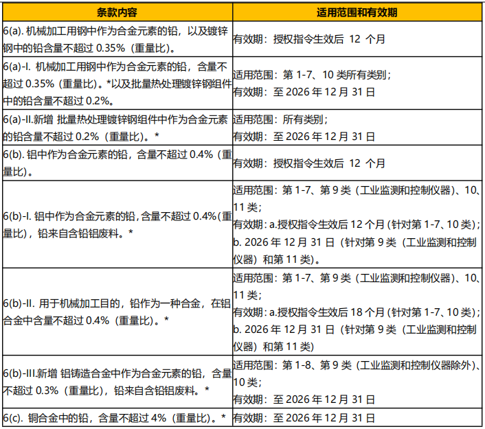 針對鋼合金、鋁合金、銅合金中的鉛豁免,草案擬更新附件 III 中第 6(a)、6(a)- I、6(b)、6(b)- I、6(b)- II和 6(c)項條款。