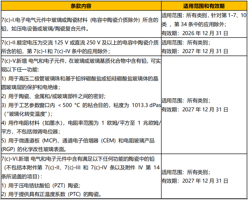 2025 年 1 月 6 日,歐盟向 WTO 提交G/TBT/N/EU/1102、G/TBT/N/EU/1103 和 G/TBT/N/EU/1104三項通知,涉及歐盟 RoHS 指令附件 III 中高頻使用豁免條款的修訂,包括 6(a)、6(a)-I、6(b)、6(b)-I、6(b)-II、6(c)、7(a)、7(c)-I 和 7(c)-II 關于鋼合金、鋁合金、銅合金、高熔化溫度型焊料、電氣電子元件玻璃陶瓷中的鉛等條款。