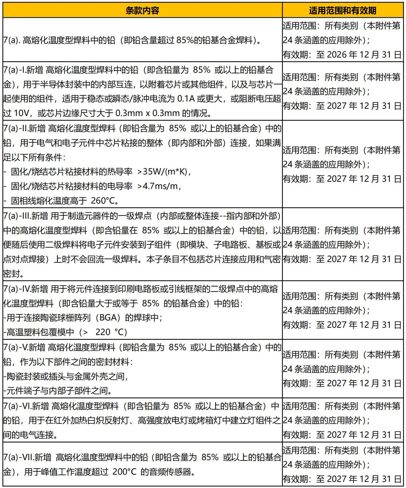 擬更新附件 III 第 7(a)項豁免條款,對高熔化溫度型焊料中的鉛的使用場景進行了說明。