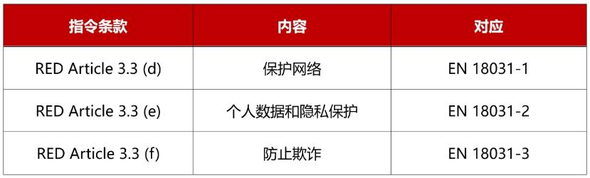 歐盟于 2024 年 11 月 30 日公告 EN 18031 標準,分別為 EN 18031-1:2024, EN 18031-2:2024 , EN 18031-3:2024 。將于 2025-02-28 正式 DOP,這意味著將有一個專用的 EN 標準來證明產品符合 RED 指令中的網絡安全要求。