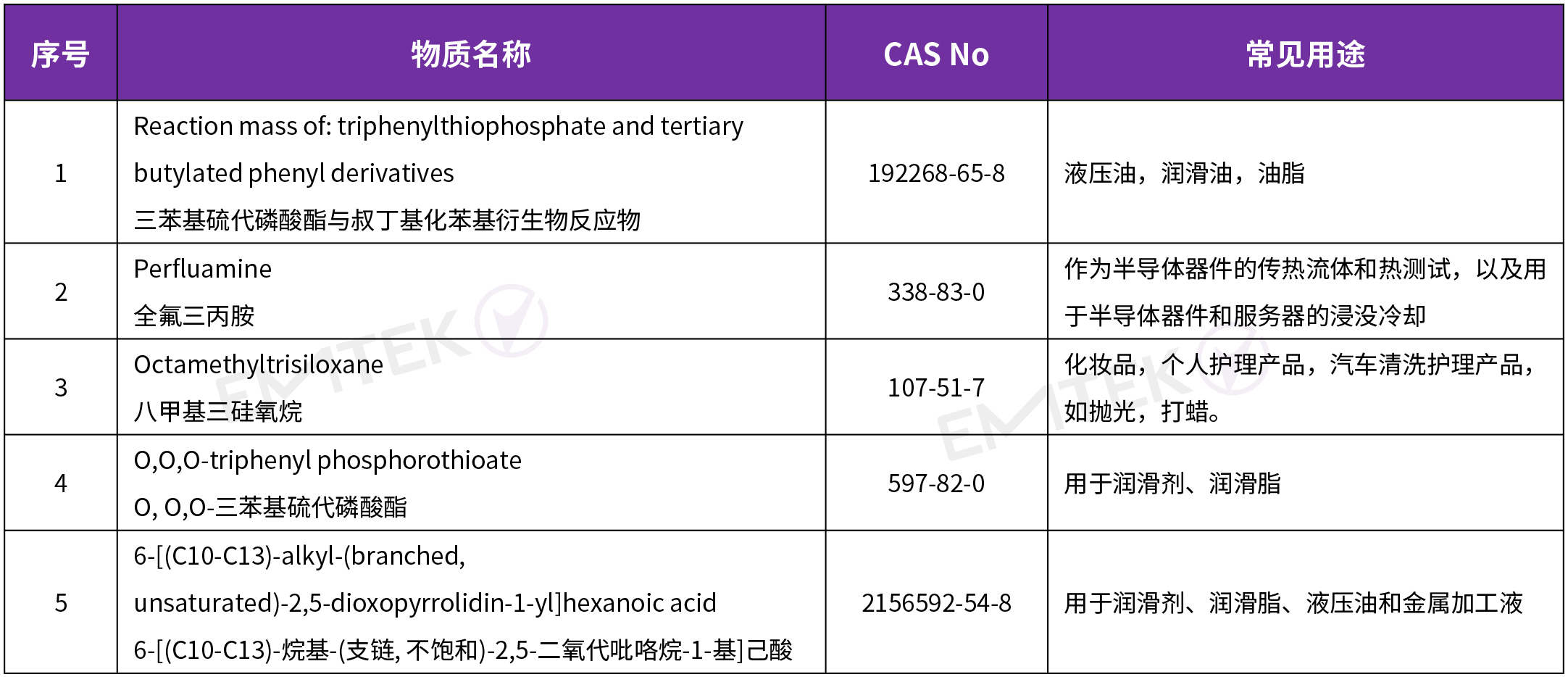2025年1月21日,歐洲化學品管理局(ECHA)正式將下面5項物質(zhì)納入SVHC物質(zhì)清單。至此,SVHC物質(zhì)清單由原來的242項增加至247項。