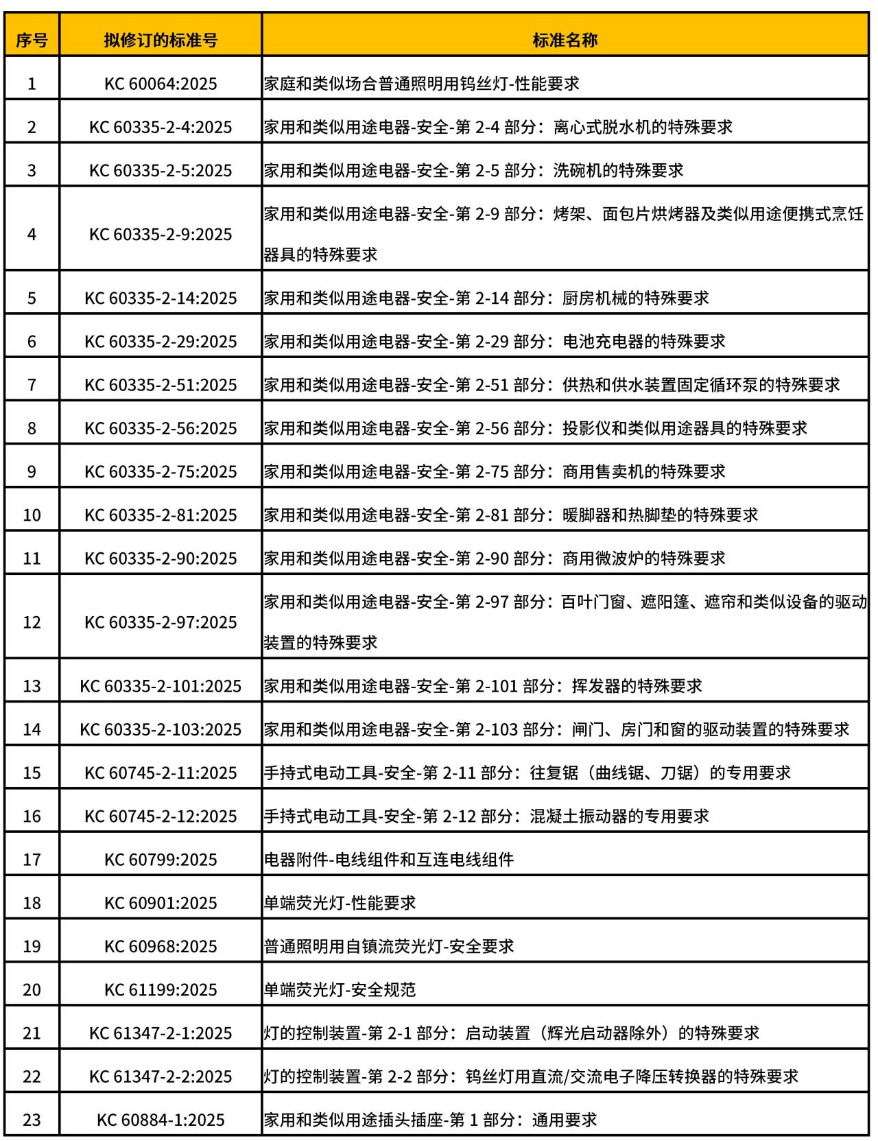 本次修訂范圍廣泛,涵蓋了 KC 系列標(biāo)準(zhǔn)中的 23 個(gè)重要類別,見表 1,包括 KC 60332 系列、KC 60745系列等多個(gè)關(guān)鍵電器安全標(biāo)準(zhǔn)。修訂內(nèi)容主要集中在三個(gè)方面:一是對技術(shù)要求進(jìn)行更新,重點(diǎn)改進(jìn)產(chǎn)品材料、結(jié)構(gòu)和安全性能指標(biāo);二是對測試方法進(jìn)行優(yōu)化和補(bǔ)充,確保評估更加準(zhǔn)確;三是針對特定產(chǎn)品的分類和適用范圍進(jìn)行調(diào)整,使標(biāo)準(zhǔn)更具針對性。