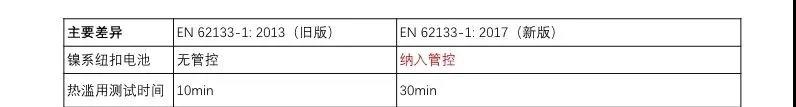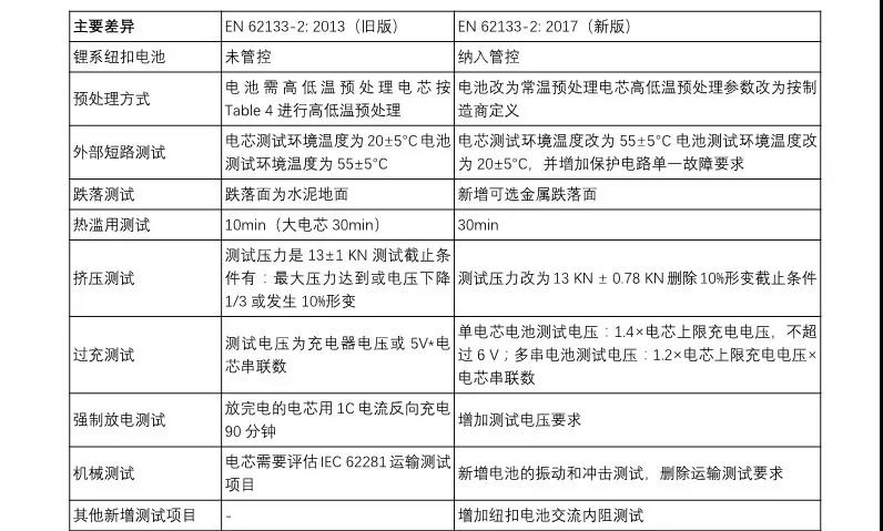 2017年5月12日,歐洲電工標(biāo)準(zhǔn)化委員會(huì)曾發(fā)布了EN 62133:2017版,分別為鎳系電池適用的EN 62133-1: 2017及鋰系電池適用的EN 62133-2: 2017。該兩版標(biāo)準(zhǔn)已于2020年3月14日起在歐洲強(qiáng)制實(shí)施,同時(shí)舊版(EN62133:2013版)將不被接受。