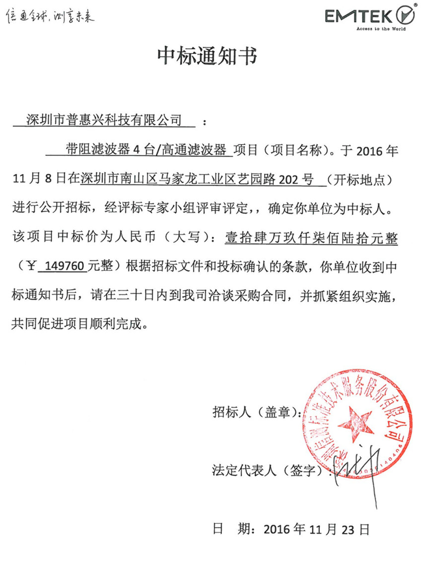 普惠興中標通知書